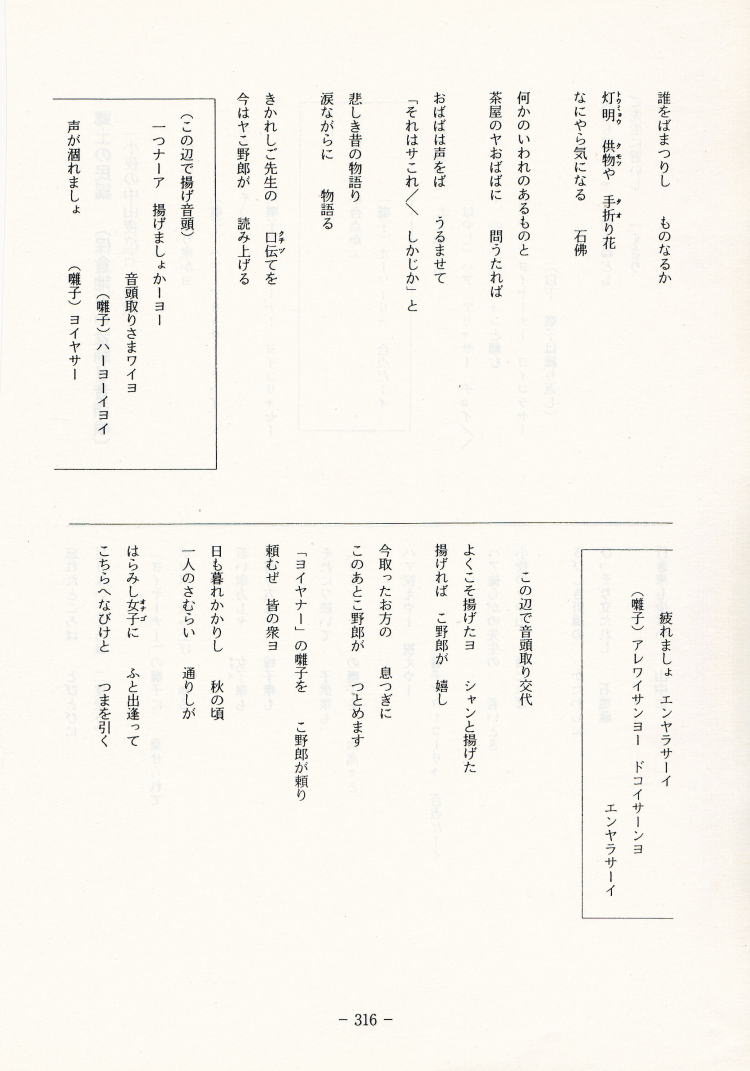 石黒に伝わるものと、筋はほぼ同様であるが石黒には文句が終わりまで書かれた資料は見当たらない。文句は終盤の途中、「刀を研ぎに出した侍に刃がこぼれた訳を問いただす」辺りで音頭取りが交代して最初に戻って繰り返すことが慣例であった。もともと盆歌は音頭取りにより口伝で唄い継がれてきたものであり、文句は若干異なり、文句が最終章まで伝わらないということがおこるのであろう。。