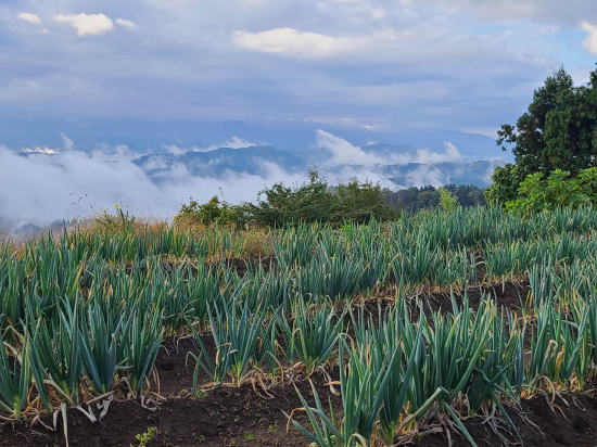 天空のネギ畑-嶽(たけ)のネギ収穫が行われました HP石黒の昔の暮らしをご覧くださっている皆さん、お元気でお過ごしでしょうか。ようやく、過ごしやすい気候になったかと思えば、はや11月となりました。ふるさと石黒も山々の木々の紅葉が始まっています。 さて、今春、5月21日の「コメントだより」でお知らせしました、有志の皆さんによる「タケやわはだネギの会」・板畑の嶽のネギが順調に成長して、いよいよ収穫の日を迎えました。収穫の初日の今日(10月30日)は、あいにくの曇り空で時々小雨がぱらつきましたが午後は青空もみられ、壮大な景観の中でのネギ収穫作業となりました。作業は5人で8時半から11時半までかかりました。収穫作業は明日、もう一日行なわれるとのことです。 1日目の収穫量は販売品として仕立てて約70kgで、栽培を指導した現地の中村稔さんによれば、上々の出来であるとのことです。 また、30日には新潟日報社と柏崎日報社の現地取材がありました。 なお、収穫したネギは、11月3日の「岡野町秋の大売出し」に、商店街で販売されます。 また、「NPО法人-石黒邑」の皆さんも当日、「秋の彩どりうどん」を出店されるとのことです。皆様、大変ご苦労様です。ご盛況をお祈りしております。 本サイトをご覧くださっている皆様、あと1週間で立冬、今年も終盤ですね。 筆者の歳(85才)にもなると、一年が過ぎ去ることの速い事に驚くばかりです。また、一年毎に衰えていく心身機能を自覚し淋しく思います。とはいえ、故郷の石黒には私と同年ですが、数町歩の田んぼを、まだ数年はやると頑張っている2人の友人がいます。上記のネギ栽培の指導者の中村さんもその一人です。私も、お二人から元気をもらって何とか、もう少し頑張りたいと思っています。 皆様、これから一日一日と寒さが増していきますが、どうぞ健康安全に留意してお元気にてお過ごしください。 皆様からの、お便りをお待ちしております。