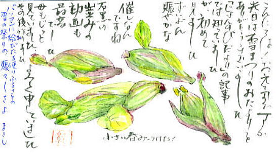 フキノトウの素晴らしい絵手紙いただました−編集会。 ![]() ( 茨城 東 結子さん 2010.3.21受信) 最新の「近況だより」の「春の到来」と冠した綺麗な写真を拝見、 しかし蕗の薹しか解からなかつたのが(木の芽はマンサク?)いささか ショックではありました。蕗の薹と時季を同じくして、あのやうな可憐な花が咲くとは! 当時は当り前のことのやうに思ひ、無関心でゐた のでせうか。 蕗の薹と言へば、過日の句会で一字詠み込みの席題に「四」の 字が出て、<四の五のと言ふて食はざる蕗の薹>を得ました。 石黒といふ山菜の宝庫の里に育ちながら、茗荷を除いて香草の 類がまつたく駄目で、食する人をいつも羨ましく思つてゐる心の吐露 でした。 ( 東京 小野島 淳さん 2010.3.18受信) ようやく春の足音が聞こえてきました。今も運動に1時間ほど毎日雪掘りをしております。積雪もだんだん少なくなり150pほどでしょうか。山の斜面も春の雪崩が起きて黒い土が見えるようになりました。玄関の鉢植えのジザクラ〔スハマソウ〕もつぼみがふくらんできました。4、5日で開花すると楽しみにしていましたが、この2、3日真冬に還ったように雪も降り、開花も足踏みをしているようです。 彼岸も近くなり本格的な春が訪れることと喜んでいます (石黒−居谷 田辺雄司さん 2010.3.12受信)