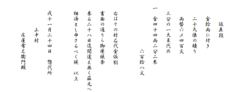 金納の場合は米の相場変動もあり決定は納入期近くまで保留し「仮値段」で請求したものであろう。
