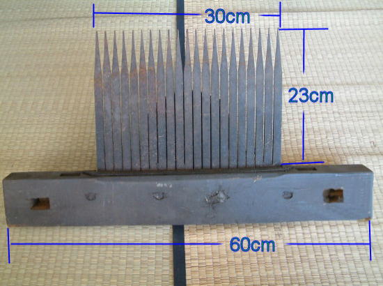 | センバ(千歯)は、江戸時代後期に発明され、それまで使っていた2本の割竹や木の棒にに、穂を一本ずつ挟んでモミを落としていたコキバシ(扱箸)に比べると、画期的な脱穀具として長く使われてきた。 センバによる脱穀はは、一束の稲穂を3つに分けて歯に通し手前に引いて脱穀した。その後、明治末に足踏み脱穀機が発明され普及すると急速に使われなくなった。 ただ、昭和20年(1945)代になっても種籾の脱穀は籾が傷がつかないことから、センバを使って行う家があった。また、昭和20年代までは、このセンバを逆さに置いた臼に固定してワラスグリに使った。しかし、センバを使うと歯の間隔が細かいため、藁の節の部分からでる葉もスグリ採ってしまうことがあるので、人の手のひらを形どったワラスグリ具を使うことが多かった。 筆者は石黒の古文書を読むために7年ほど前(2007)から読解学習をしているが「寡倒-やもめたおし」は千歯の通称で「後家倒し」ともいうことを知った。解説には、「それまで多くの寡を雇いコキバシで脱穀していたのが、元禄年間に千歯が発明されると人手がいらなくなり困ったことによる」とある。 補説資料→センバ(千歯) |