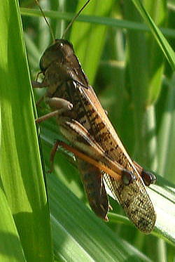 | 暮らしとの関わり トノサマバッタは、子どもの頃から最も親しみをもった昆虫の一つであった。 夏季に何度か刈り払われる農道の短い草の一面に生えたところによく見られた。 子どもの頃見た記憶では、体長10p近いものもいたように想うが、大きくて8pほどであったのであろう。飛び立つとハタハタと羽音がしたことを覚えている。 子ども達は、大物に目をつけて狙ったが捕まえることは容易ではなかった。草と土の色にとけ込んでしまい姿を見分けることが難しい。そっと近寄ると、急に足下から飛び立って初めて身を隠していた場所が分かる。 飛行距離も半端ではない。楽々と10m以上飛んだ。着地点を見定めて近づくと、またもや不意に飛び立ってしまう。今度こそと、次の着地点を目指してそっと近寄る。 灼熱の太陽、コオニユリの花、クズの花の香りを含んだ夏の草いきれ。アブラゼミ、ミンミンゼミの鳴き声、キリギリスの鳴き声・・・・・・・。 麦わら帽子をかぶり、捕虫網を持って、トノサマバッタを追った七十余年前の遠い夏の日を今も鮮やかに思い出すことが出来る。 ※酷似するクルマバッタとの違いを実物で比べてみたことはない。本ページに掲載した画像はすべてトノサマバッタであると思うがお気づきの点があったら御指導を頂きたい。 〔写真2006.8.6上石黒 上個体−雌〕 交接 ![]() 写真2014.9.29 佐水 草と土の色にとけ込んでしまう姿 写真2014.9.29 佐水交接の様子 ![]() 写真2007.10.12下石黒 褐色型 ![]() 写真2005.8.24下石黒 |