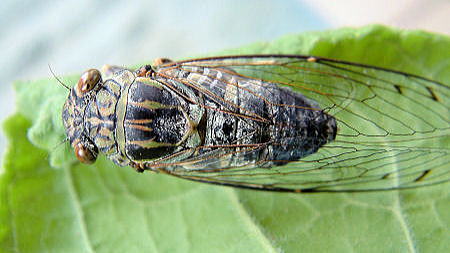 解 説 セミ科 北海道から九州に分布する中型のセミ。 オスは体長33o(ハネの先端まであわせると47o)。メスはやや小さく産卵管を持つ。 体色は頭から前胸にかけて暗黄緑地に黒斑があり、中胸は黒色部の占める面積が大きく暗黄緑色の縦筋模様がある。 ハネは透明で前ハネに黒っぽい斑紋がある。 名前の由来は鳴き声によるもの。