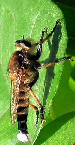 解 説 ムシヒキアブ科 成虫は40〜50pで6月〜9月にみられる。 体は外見のとは異なり頑丈で飛ぶ能力も高い。さらに太い足と何よりずば抜けた口吻を持っている。この口吻を他の昆虫の急所に差して殺し体液を吸う。とくにコガネムシを好んで捕らえる(上の下写真)幼虫も地中でコガネムシの幼虫を食べるという。 体の様子(雄) ![]() 撮影日2010.7.8下石黒 体の様子(雌) 撮影日2012.7.29畔屋