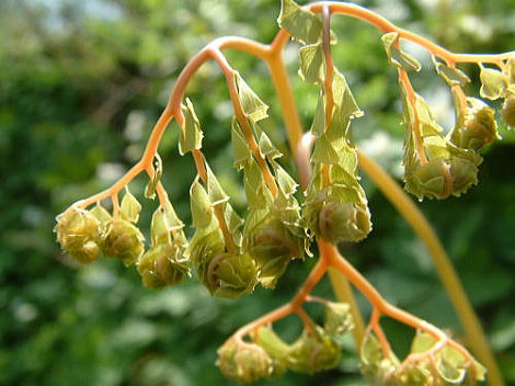 解 説 イノモトソウ科 北海道から九州に自生する多年草。山地の半日陰の斜面に多く生える。 根茎は短く横にはい多数分枝して株をつくる。 茎は葉柄とともに光沢ある黒紫色で細く堅い針金状で(上写真)、高さ25〜45p。 葉身は鮮緑色で膜質で無毛、8〜12個の羽片が扇状に広がる。各羽片は密に分裂し、中央部の羽片が最も大きく、外側のものほど次第に小さくなる〔左写真〕。 小羽片は短柄をもち半月状で上側の縁に数個の切れ込みがあるが下側は全縁である〔下写真〕。 胞子嚢群は小羽片の前面に数個ついて葉の縁が折れ曲がって胞子嚢群を包む〔下写真〕。 春の若葉は赤味を帯びている〔左下写真〕。葉は成長するにつれ緑色となり、扇状の葉身がクジャクの羽を連想させる。 観葉植物として栽培される。 名前の由来は葉がクジャクの羽に似ていることによる。 クジャクシダの葉 ![]() 写真2004.11.20下石黒 羽片の短い柄 ![]() 写真2004.11.20下石黒 小羽片の前面につく胞子嚢 ![]() 葉の縁が折れ曲がって包む胞子嚢 ![]() 写真2011.8.4下石黒 クジャクシダの若芽1 ![]() 写真2009.4.18下石黒 クジャクシダの若芽2 ![]() 写真2009.4.27 下石黒 |