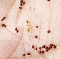解 説 ザクロソウ科 畑、道端、庭などに生える一年草。アメリカ原産の帰化植物。江戸時代末に新潟県の海岸で発見された。現在では全国で見られる。 茎は無毛で下部から分岐し、長さ10〜25cm。枝は開出し地面につく。 葉は4〜7個が輪生し、さじ形または倒披針形で円頭またはやや尖り長さ15〜27mm。 花期は7月から9月。花は葉腋から花茎を立てて先端につく。ガク片は5個で長楕円形で3脈がある。雄しべは3~5個。葯は楕円形で2室。子房は1個。花柱は3個で短い。開花は午前中。 さく果は楕円形、長さ3mm。種子は卵形、茶褐色で光沢があり、長さ0.4mmほど。 酷似するザはクロソウは、集散花序をつけることで区別できる。 名前の由来は葉が車輪状に輪生することによる。 花期から果実期へ 写真2021.8.25 新田畑雌しべに張り付くようにつく雄しべ 写真2021.7.29 新田畑種子 ![]() ![]() 写真2021.7.29 新田畑 全体が小型な個体 写真2021.7.31 新田畑