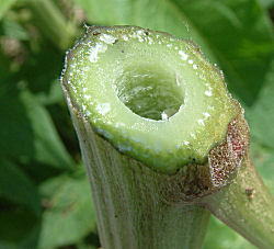 解 説 キク科 中部以北の主に日本海側の山野に生える多年草。 根茎は白く太く横に長く伸びる〔下写真〕。 茎はよく枝分かれして高さ1〜2mになり、中空である。(下写真) 葉は互生し下部は切れ込みがあるが上部はない〔左写真・上写真〕。 葉の長さ15〜35p。花の咲く頃には下部の葉は枯れて無いことが多い。 茎葉は深い切れ込みはないか、あるいは浅裂ないし中裂し、形には異変が多い(下写真若葉参照) 葉裏はちぢれ毛があり白味を帯びている〔下写真〕。まばらにクモの巣のような毛がある。 花期は8〜10月。紅紫色の花が横向き、ないし下向きにつく。花柄は3〜10p、花の形は広鐘形長さ1.5〜2p、径1.5〜2.5p。総包片は7列、反曲し、粘着しないがたまに内片に腺体があって少し粘ることもある。外片は長さ1p、卵形で先が尖る。花冠の長さは1.5〜1.9p。冠毛は1.2〜1.2p。 そう果は淡褐色。 名前の由来は南部(岩手県)産の山アザミの意味。 下部と上部の葉の変異 ![]() ![]() ![]() ![]() 2005.7.8下石黒 茎の断面 ![]() 2009.5.8寄合 つぼみ ![]() 2005.9.20下石黒 花 ![]() 2005.10.2寄合 マルハナバチの吸密 ![]() 2009.11.11下石黒 花後姿 ![]() 2010.9.15 市街地周辺 果実期 ![]() 2009.11.9下石黒 種子 ![]() 2007.11.5寄合 葉の先のトゲ ![]() 2009.5.8寄合 葉の表裏 ![]() 2009.5.8寄合 根茎 ![]() 20096.6.12下石黒 黄葉したナンブアザミ ![]() 2009.11.9下石黒