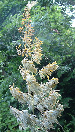 | 暮らしとの関わり 石黒では「ヤマチンキ」とか「トートガラ」と呼んだ。方言の呼び名の由来は、前者は、茎を折るとヨウドチンキのような液が出ることによるものと想われる。後者は、とう(茎)が高く中がカラ(空)であることによるのではなかろうか。 タケニグサは、道ばたなどに多く見かけられるが、有毒であるだけに見た目にも一種の毒々しさを感じる草であり、あまり好かれない草の一つであろう。 しかし、欧米では鑑賞用に庭に植えられるという。タケニグサは中国と日本にしか自生していない植物であることから欧米では珍重されるのであろう。 ちなみに別名チャンパギクのチャンパはインドシナの古い国名であり、その地からの渡来植物と考えられたが当地にはタケニグサは自生していないという。 村の道ばたのタケニグサ→参考画像 (写真上2005.7.5上石黒 写真右上2005.7.11板畑 右下2004.10.26寄合) 若芽 撮影2010.5.19下石黒タケニグサ若草 ![]() 撮影2005.6.8下石黒 小群生 ![]() 撮影2012.7.10大野 花の最も美しいころ ![]() 撮影2005.7.19 大野 果実期の様子 ![]() 写真2014.9.17板畑 背景黒姫山 果実期の様子2 写真2015.9.21寄合-風張りタケニグサ茎の空洞と黄赤色の汁液