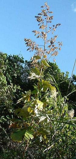解 説 ケシ科 本州から九州の土手や草むら、荒れ地などによく見られる大型の多年草。 有毒植物。 根は大きくオレンジ色(左下写真)日本と中国に2種しかない植物。 茎は中空で直立し高さ3mに達するものもある。ふつう分枝しない。草全体が粉をふいたような色合いであるが葉の裏は特に白い。 葉は互生し柄があり長さ20〜30p。葉は丸い心臓形で縁には鈍く浅い裂け目が入り、裂片には鋸歯がある。裏面は細毛がやや密生する。(下写真) 花期は7〜8月。茎の先に大形の円錐花序をつける。 花はやや小形で花柄がある。ガク片は2個、長さ約10o。白色まれに紅色を帯びることがあり、開花直前に落下する。花弁はない。雄しべは多数、ヤクは線形で黄色で長さ3〜4o。糸状の花糸がある。 花はヘラ形で白い縁のついた2個のガク片は1pほどの長さで開花するとすぐに落ちる。花弁はなく多数の雄しべと1個の雌しべがある。 花の後、細長く扁平なさく果〔熟すと果皮が割れて開く果実〕をつける。長さ2.5p、幅5oほどで先端に花柱が残っている。その中に細かい種子があり〔左下写真〕地上に落ちたあと蟻によって運ばれて繁殖するという。 名前の由来には、竹に似ているからという説と、竹と一緒に煮ると竹が柔らかくなることによる、の2説がある。 ゴボウトガリヨトウの食草。 葉裏の毛 ![]() 撮影2009.5.31 下石黒 白色を帯びた葉裏 ![]() 撮影2005.7.3落合 花 ![]() 写真2005.7.12下石黒 秋のタケニグサ ![]() 撮影2005.10.19寄合 3mを越えた個体 ![]() 写真2016.7.16下石黒 雅子 花序-果実期 ![]() 撮影2010.8.4上石黒 さく果の中のまばらな種子 撮影2005.10.19寄合種子拡大 ![]() 2004.10.26寄合 冬の枯れた茎 撮影2009.1.8板畑 |