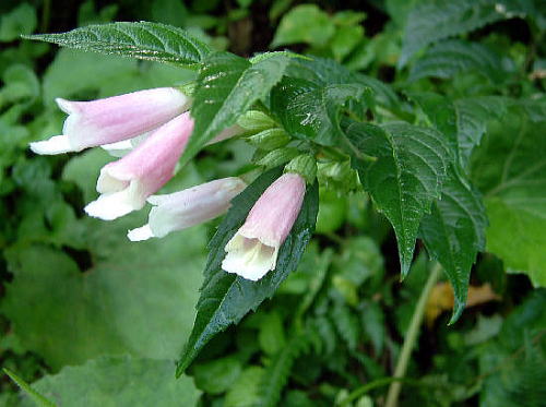 解 説 シソ科 北海道から九州の湿気のある林や谷間などに生える多年草。 茎は四角形で、やや木質の根元から数本生える。高さ60〜100p。あまり枝分れせずに多く斜め傾く。茎には開出毛がまばらに生える。 葉は対生し長さ5〜12oの短い柄がある〔下写真〕。葉の長さは10〜20p、幅3〜10pで卵形で先は尖り縁には粗い鋸歯がある〔左上写真〕。上面には斜めの毛があり〔下写真〕下面の脈状には開出毛がある(下写真)。 花期は8〜9月。葉のつけ根に1〜3個の唇形の花をつける。花には短い柄があって淡紅紫色で長さ4〜5p。ガクは鐘形で長さ1〜1.5p、浅く5裂ける〔左写真〕。 花冠は長さ4〜4.5p、筒部が長く上唇は短く、下唇は3裂し、中央裂片は大きい〔左写真〕。雄しべ4本のうち2本は長い〔左写真〕。 果実は長さ15〜18oの卵球形で〔上写真〕4個の分果からなり、分果は永続性のガクに包まれて楕円形で無毛、長さ7〜8o〔左写真〕。 名前の由来は「麝香草」の意味で茎葉をゆすると好い香りがするというので名付けられたというが実際にはほとんど香りはない。 ジャコウソウ葉〔裏〕 ![]() 写真2007.9.2寄合 葉表面伏せ毛 写真2009.10.14下石黒四角の茎と開出毛 ![]() 写真2007.9.2寄合 種子散布期 ![]() 写真2011.11.4上石黒 |