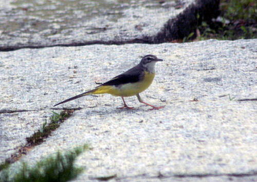 解 説 セキレイ科 北海道から九州の各地の水辺に普通に見られる。 体長17p。体の上面は青灰色、下面は淡い黄色で尾は長く体の約半分を占める。メスの体色はオスに比べて腹部の黄色が薄く、のどの黒い斑点がない。尾を上下に振りながら水辺を歩き餌を探す。 鳴き声は「ツツン、ツツン」あるいは「チチン、チチン」と聞こえる。家の軒下や橋、石垣などに巣をつくり、1腹4〜6個の卵を産む。雌雄交替で11〜12日抱卵して孵す。