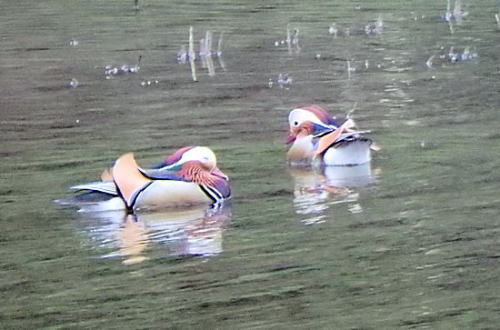 | 暮らしとの関わり オシドリを含めてカモ類は石黒ではあまり見かけない鳥である。繁殖期でないと目立たないので見てもオシドリと分からないことも多いのであろう。 昔は、落合川によく見られた。 筆者は以前に下石黒の川の上に張られた架空索道のワイヤに衝突して落下するオシドリ〔繁殖期のオス〕を目撃したことがある。死骸を拾って詳細に観察したがその羽の美しさに驚いた記憶がある。 昨日、石黒の畑にサトイモを植えに行った。前々日の村の道普請と翌日の冬囲い竿置場つくりでいささか疲れがたまっていて気が進まなかったが種イモの葉が開いていたので行かざるを得ない。 あいにく朝から小雨模様の天気であった。畑のサク切りをするにも雨で土が粘って鍬について離れないので例年より骨の折れる作業であった。 夕方、仕事を終えて帰宅の途中上石黒のはずれで田植え前の水田にカモらしい姿を妻が見つけて車を止めてカメラの望遠レンズで確かめるとオシドリのオス3羽であった。夕方で雲が厚く撮影条件は良くなかったが何とか撮影できた。 気の進まないサトイモ植えであったが、思わぬ出会いに恵まれた。 〇ビデオ資料 水田を泳ぐオシドリ 〇ビデオ資料 つがいのオシドリ 〇ビデオ思慮 田植え後の水田のオシドリ (写真撮影 2015.5.19 上石黒) 繁殖期のオスとメス ![]() 写真 道郎 オス ![]() 写真2015.5.19上石黒 水田 オス-2 ![]() 写真2015.5.19上石黒 水田 |