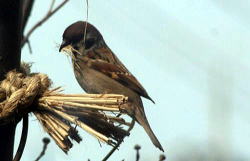解 説 ハタオリドリ科 日本全国に分布し最も身近な小鳥。留鳥であるが夏は人家付近にすみ秋から冬にかけて南部、静岡や神奈川あたりまで移動し平野にすむ。 全長約15cm。背面は茶褐色で黒い縦斑があり腹面は白っぽい。眼からほおにかけて黒い斑点がありのどは黒い。雄雌同色。嘴は太く短く細かいものを食べるに適したつくり(下写真)。幼鳥は嘴が黄色い。 初夏に人家の屋根などに巣を作り卵4〜6個ほどうむ。 餌は夏の間は主に昆虫で益鳥であるが秋には稲穂などを拾って食べるのはよいが、稲の実る直前に大群で現れ胚乳をつぶして食べるために害鳥となる。写真 名前の由来は「スズ」は鳴き声から、「メ」は小鳥の意味など多説ある。 一年中身近にられる ![]() ![]() ![]() 2009-213市街地 毛虫を捕獲したスズメ ![]() 写真2015.7.26松浜 短くて太い嘴 ![]() 写真2016.2.11藤井 ススキの穂を食べるスズメ ![]() 写真 2010.12.4 藤井 春を待つスズメたち 写真 2019.3.16藤元町稲への被害→拡大クリック ![]() 写真 2020.8.17新田 |