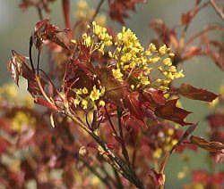 解 説 カイデ科 北海道〜本州の日本海側に分布。雌雄混株の落葉高木。高さ20m。 葉の径は6〜14pで、長い柄があって対生する。柄は無毛。若い葉は美しい赤味を帯びる。 葉の切れ込みは浅く先は針状にとがる(下写真)。葉裏が無毛。 花期は4〜5月。花は淡黄色で新枝の先の花穂につく。花弁は5個で長さ7〜8o。雄しべは8個で花盤のくぼみにつき両性花のものは短い。子房に毛はない。 果実(分果)には翼があり2個がほぼ平行につく。(エゾイタヤに比べて角度が狭い) 名前の由来は新芽が赤いことによる。 アカイタヤ若葉 ![]() 写真2009.4.30小岩峠 夏期に希に見られる芽 ![]() 写真2006.6.2大野 針状に尖る葉の先端 ![]() 両翼の角度の狭い分果 ![]() 写真2011.10.27下石黒 |