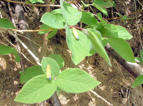 解 説 スイカズラ科 北海道から本州の山地に生える落葉低木で高さ2mほどになる。 枝は灰褐色でほとんど無毛だが初めのうちは毛がある。 葉は卵状楕円形で先端は次第に細くなってとがり、基部は円形。葉の長さは8p、幅4pほど。膜質でやや硬く両面や柄に粗い毛がある。下面はしばしば粉白色になる。 花期は3月下旬〜5月に新葉とともに開花する。花は下向きにつき漏斗状で(上写真)長さ2p以上にもなり、基部にふくらみが見られる。色は淡黄色で5個の裂片は同じ大きさである。 子房は2個ずつ離れて並んでいて毛がある。基部には卵形の先の尖った長さ1〜2pほどの大きさの包葉が2枚あるのが特徴である。(下写真) 果実(液果)は球形で熟すると赤くなる。 名前の由来は粗い毛があり、ヒョウタンボクに似ることによる。 開花前 写真2019.3.26板畑2019年3月26日の風景 ![]() ※左写真撮影の道路から南方の景観 つぼみ 写真2019.3.26板畑大きな包葉 写真2016.3.30板畑果実期へ 写真2016.4.13板畑果実 写真2016.5.25嶽葉の表裏 ![]() 写真2016.4.13板畑 |
