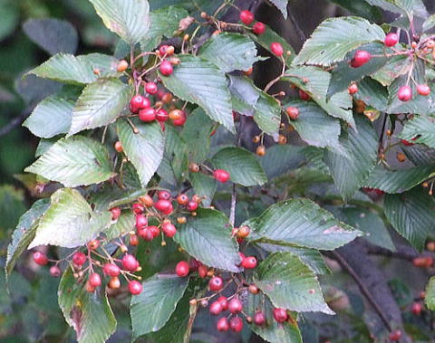 解 説 バラ科 本州、四国、九州の山地に生える落葉高木。高さ10〜15mとなる。 幹や枝は紫黒色で白色の皮目が斑点状についている。〔下写真〕 葉は、柄があり卵形で互生卵形で長さ7〜10p。 先は尖り縁には重鋸歯〔大きな鋸歯の上に更に細かな鋸歯がある−下写真〕がある。側脈は整っている(下写真)。 葉の質はかたく深緑色で無毛であるが裏面には初め、うすく毛があり後に無毛となる。 葉柄は1.5pくらいで托葉は早く落ちる。 花は5〜6月に咲き、白い花〔上写真〕を新枝の先端及び葉のつけ根からまばらに花のついた散房花序を出す。包葉は早落性、花の径は1〜1.5p。ガク筒は狭い楕円形、ガク片三角形で内面に綿毛がある。花弁は広楕円形または円形で基部に綿毛がある。雄しべは20個ほど花柱は2個(下写真)。 果実は、やや楕円形で直径8〜10ミリ。色は、紅色で後に柿色(上写真)。白い皮目が散在する〔下写真〕。 名前の「アズキ」は小さいという意味。果実も小豆に似ている(左下写真)。 若木の樹皮 ![]() 写真2011.12.10 板畑 嶽 老木の幹の裂け目 ![]() 写真2005.12.4下石黒 つぼみ・雌しべ・花柱 ![]() ![]() ![]() 写真2005.5.9下石黒 葉脈のの整った葉 ![]() 写真2004.12.4下石黒−城山 果実の拡大写真 ![]() 写真2005.10.28下石黒 自然落下したもの ![]() 写真2011.12.2大野 |