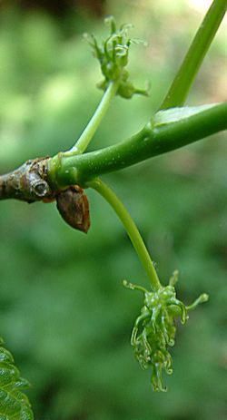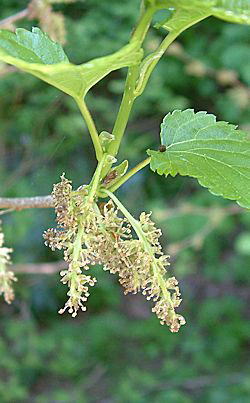 解 説 クワ科 日本全土に自生する落葉高木。高さ7〜10m、幹の径60pに達するものもある。雌雄異株。 蚕の食草。現在見られるものはヤマクワと栽培種のマグマである。 養蚕のための木は刈り取るため長大にしない。しかし時には深山にいくと大木に出会う。〔参考画像〕 樹皮は淡褐色、葉には深い切れ込みがある(変異に富む)。 花期は4〜5月。淡黄緑色の花をつける。 果実は熟すると黒くなり味は甘い。 樹皮の繊維は強く、太平洋戦争中には衣服を作るために供出をさせられた。 名前の由来は食葉〔クワ〕、または蚕は〔コハ〕が語源とする2説がある。 雄花 撮影日2009.6.3.寄合