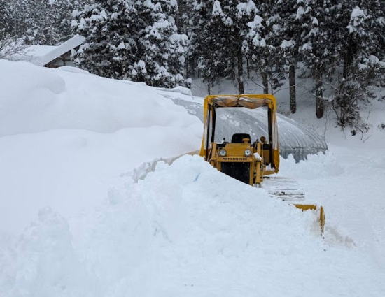その後、3日の夕方から冬型が弱まり翌4日は予期せぬ快晴となりました。その後再び雪となり本日1/6の積雪は板畑で160㎝、上石黒95㎝、落合115㎝となり現在も降雪が続いております。