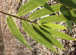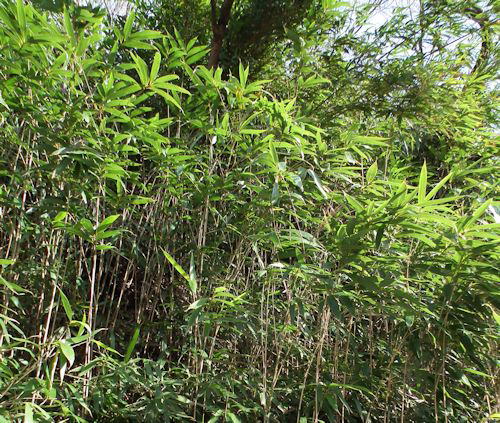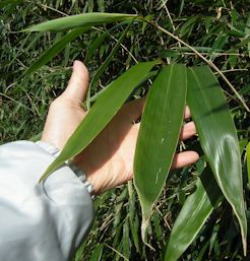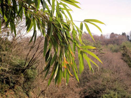 | 暮らしとの関わり ヤダケは石黒で出会ったことはない。おそらく、多雪地帯のため育たないのであろう。ヤダケだけではなく竹類は石黒ではネマガリタケの他は少ない。 昔はモウソウチクやメダケを家の近くに植えておく家もあった。メダケなどは雪害を防ぐために杉林の縁に植えて冬季には杉の木に縄で結わえておいた。 モウソウチクも数本の杉の木の間や周りに植えて雪の害を防いだ。また、若竹のうちにゆすって先端を折って落として育てる工夫も行われた。 子どもの頃には遊び道具の竹とんぼや水鉄砲、紙鉄砲、それから杉の雄花を弾にした鉄砲などを作って遊んだが、竹が少ないために材料を手に入れるために苦労した記憶がある。杉鉄砲などは細い竹を使ったが、残雪の上からメダケの枝をとって使った。杉の雄花を入れて押し出すとパチンという音とともに黄色い花粉が煙のように出るところに興味をもって遊んだことを憶えている。 ちなみに、ヤダケはササの仲間であるという。その区別点は竹の稈が長く皮につつまれていることにある。 〔写真2007.10.2 落合〕 山に自生するヤダケの先端 ![]() 写真2014.1.3畔屋 屋敷内に植えられたヤダケ ![]() 写真2012.10.13茨目 葉のつけ根 ![]() 写真2014.1.7畔屋 |