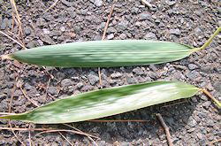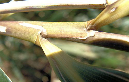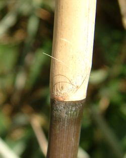 解 説 イネ科 日本各地に群落をつくり、自生状態であるが、もとは栽培されたものが野生化したものであろう。 地中を横にのびる地下茎から粗い毛の生えた皮につつまれた稈が出る。 稈は直立して高さ3〜4m。切り口は、ほぼ正円で径15〜20mmほど。節は平坦でほとんど膨らまない(下写真)節間は長く30p前後。 上部の節から1本の枝を出し、枝は更に多数の小枝に分かれる。 葉は、先の尖った細い披針形で小枝の先に3〜10枚つく。質は皮質で表面は緑色、裏面はやや白色を帯びる(上写真)。 葉の縁はざらつき葉舌は截形、葉鞘は節間とほぼ同長で白っぽい。 夏に稈の上に長い柄をもった円錐花序に花穂をつける。 中軸から小柄が出てその先に小穂がついている。小穂は、2列で10個ほどの緑色の花からなり花は中軸上に密着している。 穂は細長い披針形で尖り長さ13〜14mmほど。護頴は卵形で16〜17本の脈をもつ。内頴は護頴より短く、隆起した線が2本ある。雄しべは3〜4個ある。 名前の由来はこれで矢を作ったことによる。 ほとんど膨らまない節 ![]() 写真2014.1.3畔屋 葉の数 写真2014.1.3畔屋